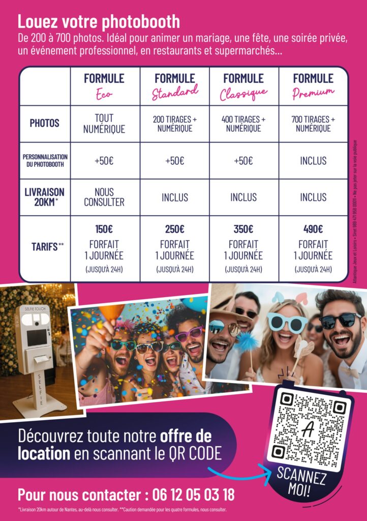 Pour réserver, rendez-vous sur le site de Location Photobooth 44, choisissez la formule qui vous convient et complétez le formulaire en ligne. Une fois votre demande validée, Location Photobooth 44 vous enverra une confirmation et les modalités de paiement.